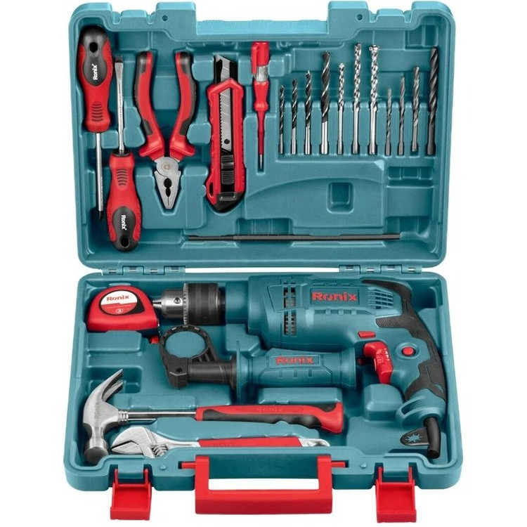 کیت دریل برقی چکشی 13 میلیمتری رونیکس مدل RS-0001، در یک جعبه رنگی و یک کیف ضد ضربه و محکم BMC همراه با ابزارها و متعلقات زیر به بازار ابزار ایران و جهان عرضه میشود: